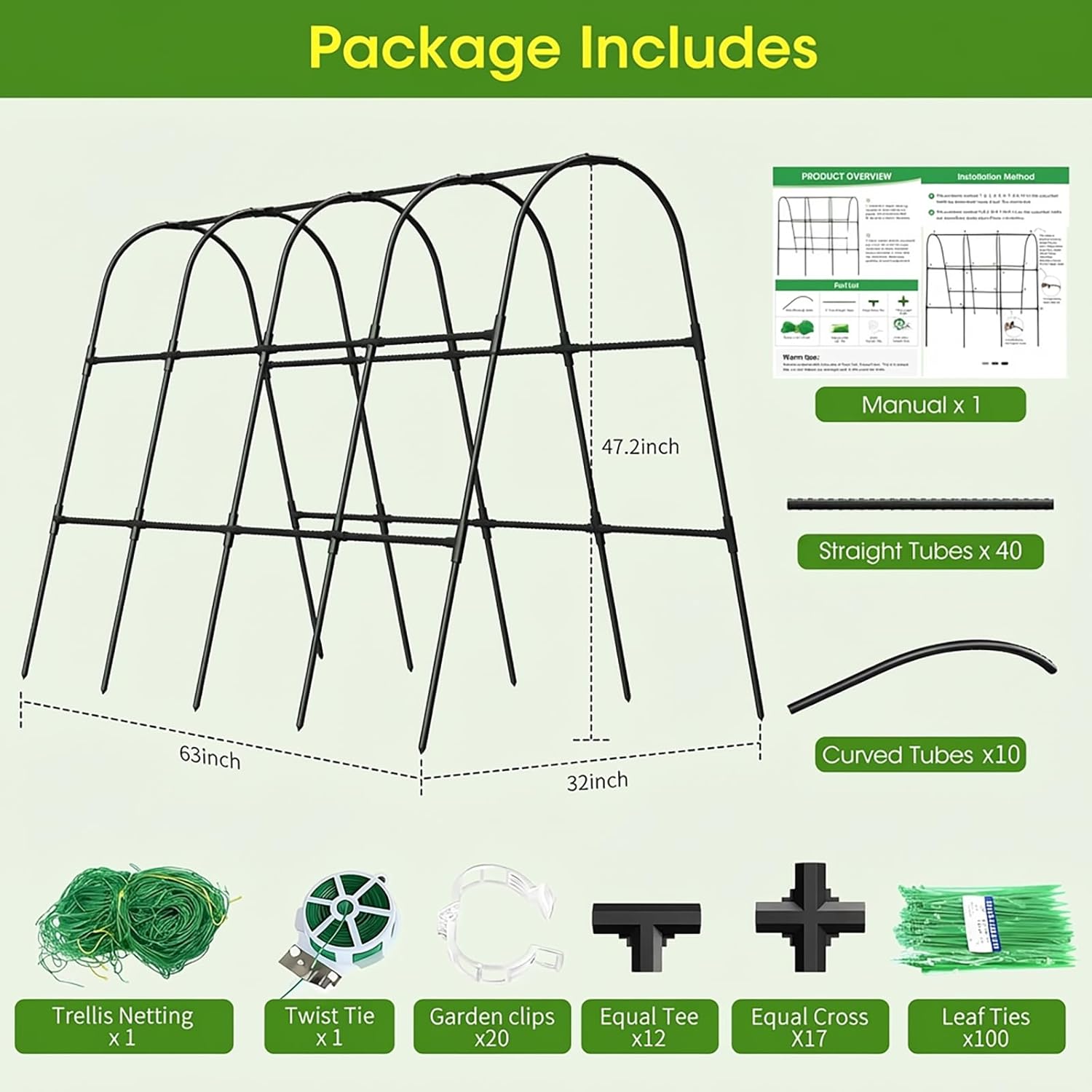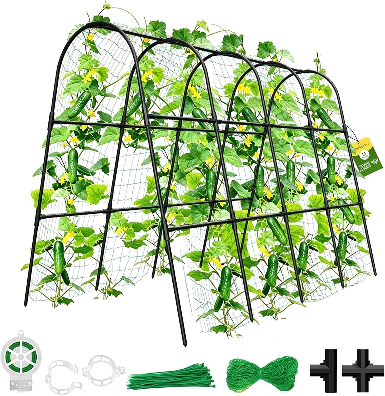【Package Detail】Super High Cucumber Trellis X1(47.2×47.2″X21.6″),Garden clips X20,Leaf Ties X100,Twist Tie X1,Trellis NettingX1,Manual X1.
