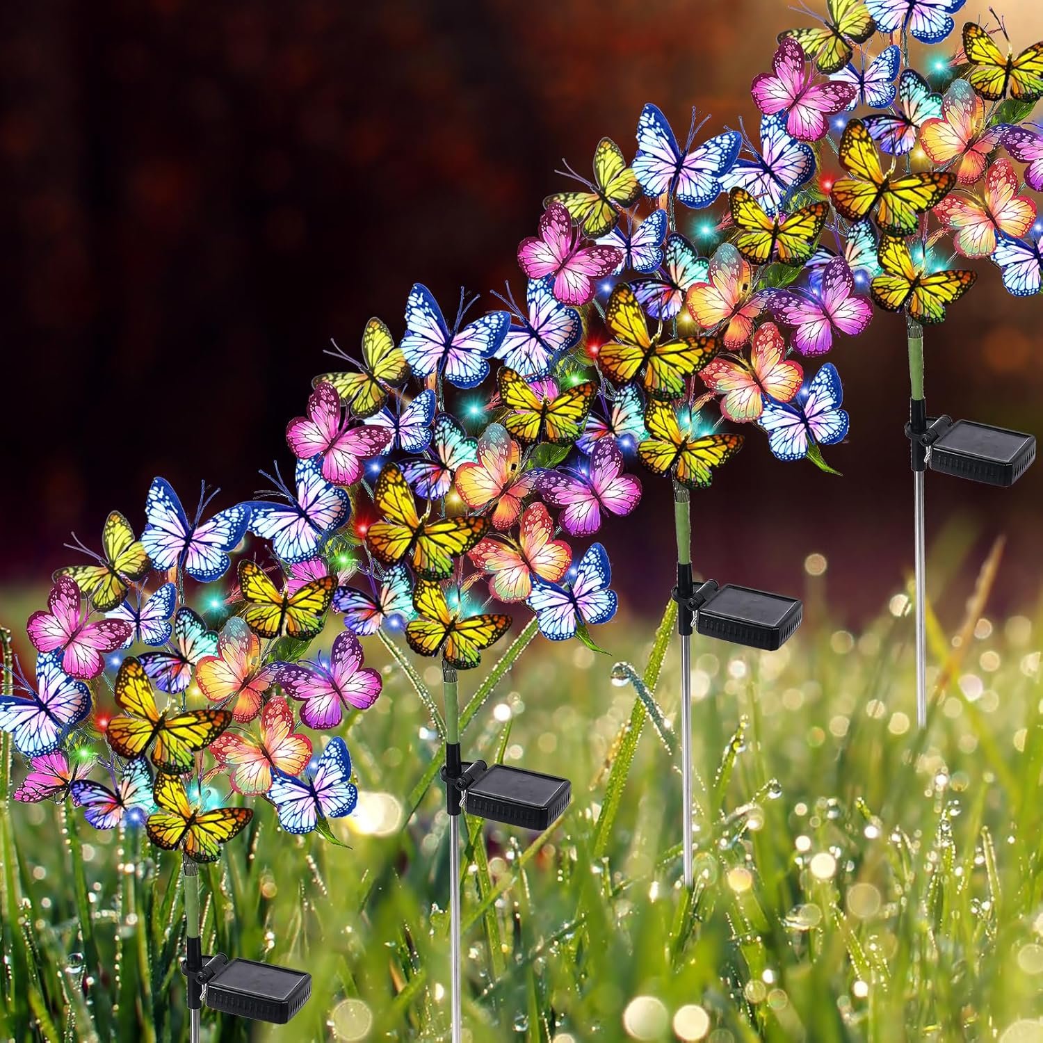 【NEW UPGRADED UNIQUE BUTTERFLY SOLAR GARDEN STAKE LIGHTS】4 Pack Solar Garden Lights Outdoor are composed of 68 lifelike butterflies and 88 multi-color LEDs fairy string lights. The Butterflies are made of high quality fabric and exquisitely designed to imitate real butterflies, adding lots of vitality for your garden or yard.