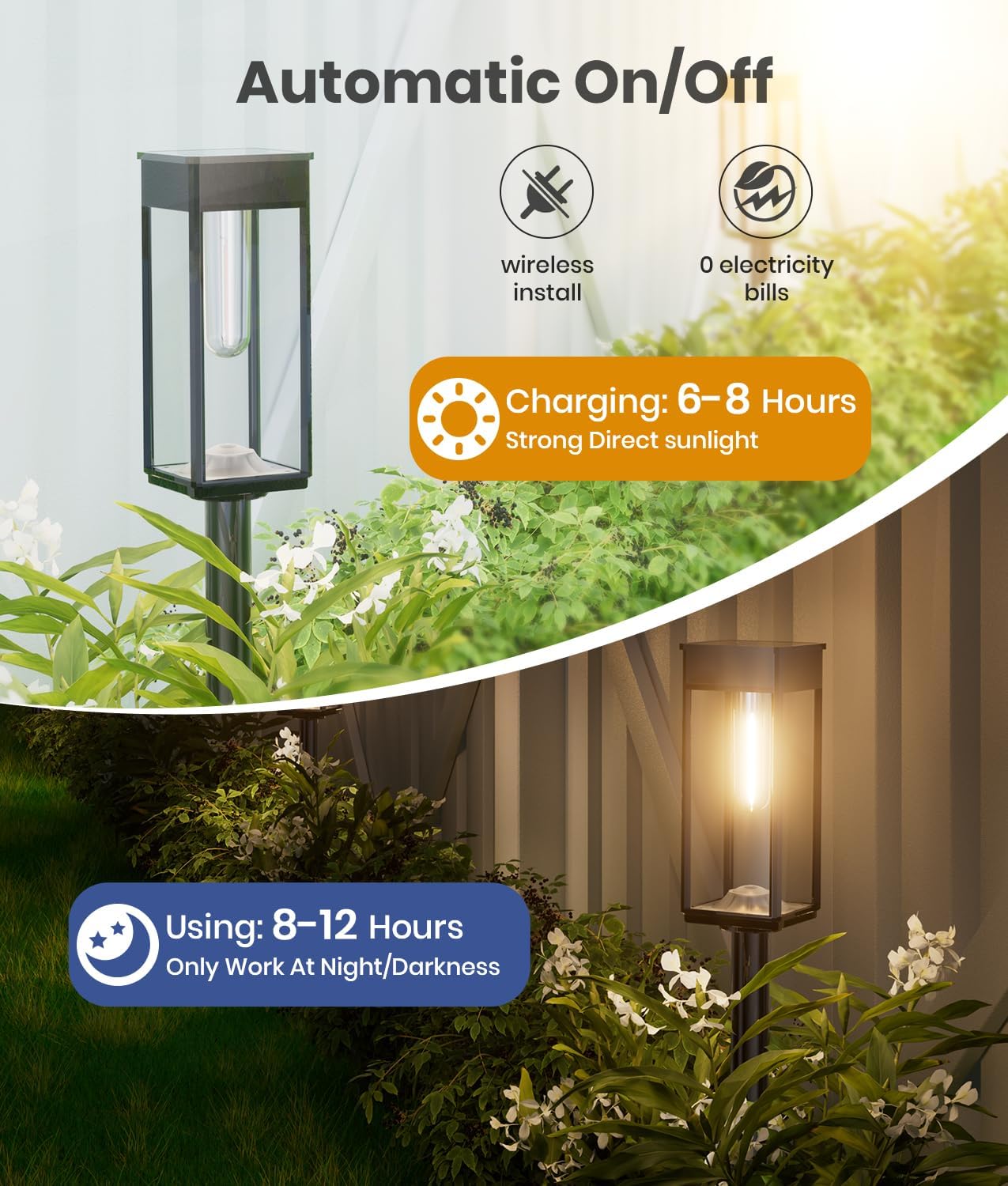 Automatic On/Off & All-Weather Durability: Enjoy hassle-free operation with the auto on/off feature. The outdoor solar lights automatically turn on at dusk and off at dawn, providing seamless lighting without any manual intervention. With their IP65 waterproof rating, these solar garden lights can withstand various weather conditions, including rain, snow, frost, and sleet.