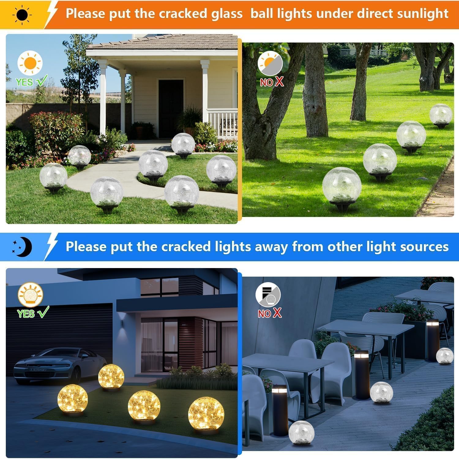 【Unique Crackle Design & Ideal Present】Solar garden light crackle effect is clear and realistic, using solar technology and environmentally friendly and energy saving warm white LED light, unique thick crackle glass ball design creates a warm and romantic atmosphere. Ideal gift for outdoor party, can be used as moon light garden decoration