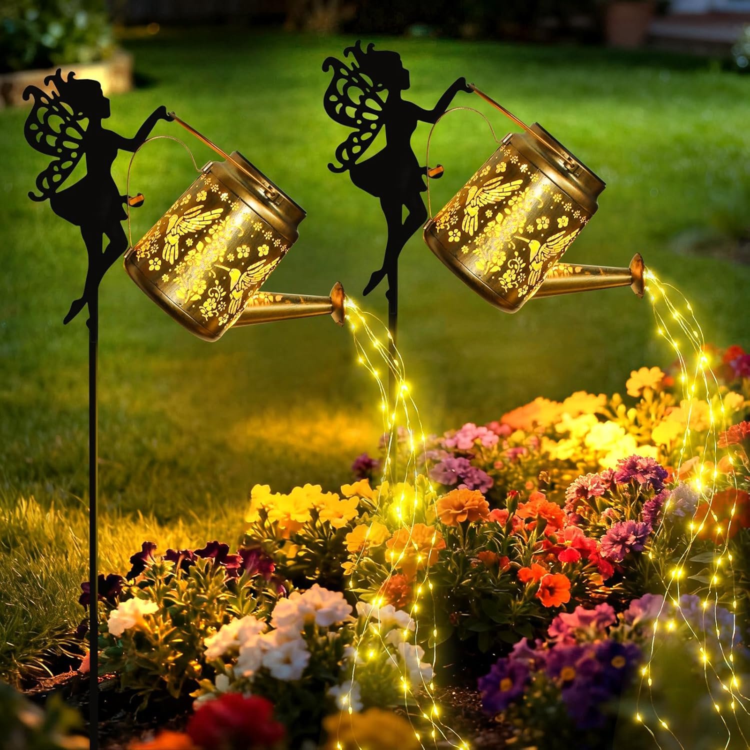 【Multi-scenario Application】The outdoor solar lights can be placed in front yards, backyards, lawns, or flower beds. Their adorable fairy designs and realistic water-flow lighting effects can beautifully decorate any outdoor space, creating a warm and cozy atmosphere for viewers.